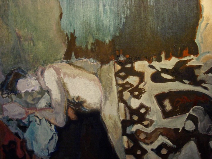 I’m runnin a bath and stripping off while I’m painting the pattern on the blanket over a big leg and if I get the pattern right there’s a big leg too. Something I hanker over  like an animal set in the bourgie paradigm of parlor decoration and oil paint. Set in a lot of paradigms and shrugging off each as a poor fit. I got a letter on facebook from a young and distant cousin. He said growing up baptist in this little town he always felt like he was being watched, on display. Jaysus missing nothing with his helpers licking ice-cream and never missing a beat either, main street Friday night. This cousin’s a musician, a performer. If you can’entirely conform you can at least entertain mebbe. A lot of my family performs, though when we were kids the constant refrain every time you opened your mouths was “Don’t be bold”.