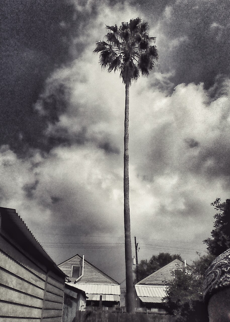 He and I kept a wood fire going five months in the snow up north, kept warm, but my arms still ache from swinging the axe. Now its warm night in black leather. I like wandering alone, no connection to make. He finds friends. Nobody knowing where I am. Looking. Palm fronds above my table, the sound of a night train. Walking home last night we got held up by a mile of still, wheezing iron and clambered up and through between the cars under this gibbous moon. I stepped on a possum last night, coming out of a late dive bar, almost went up my leg, kicked it aside. No lie. Ah the south.